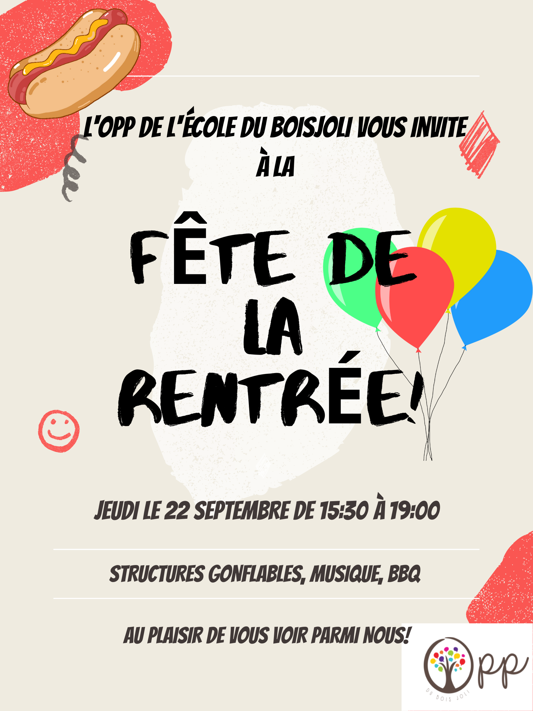 L’organisme de participation des parents (OPP) de l’école du Bois Joli vous invite à son super BBQ de la rentrée! Venez déguster de bons hot dogs, croustilles et breuvages! Différentes structures gonflables seront sur place pour les enfants. La fête débutera à la fin des classes et se poursuivra jusqu’à 19 h. Les familles et amis du quartier sont les bienvenus!